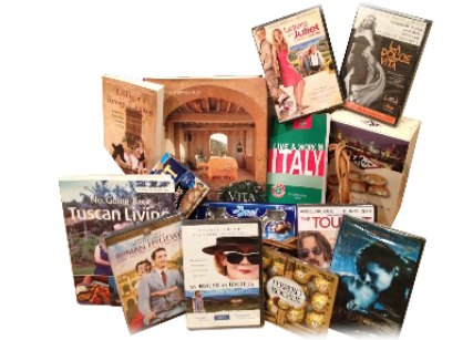 For those in love with Italy, a sturdy handwoven natural twig basket is filled to the brim with beautiful photos, books to inspire, delightful movie favorites and made in Italy treats to arouse your imagination and let you escape to Italy as often as you like, before you get there.